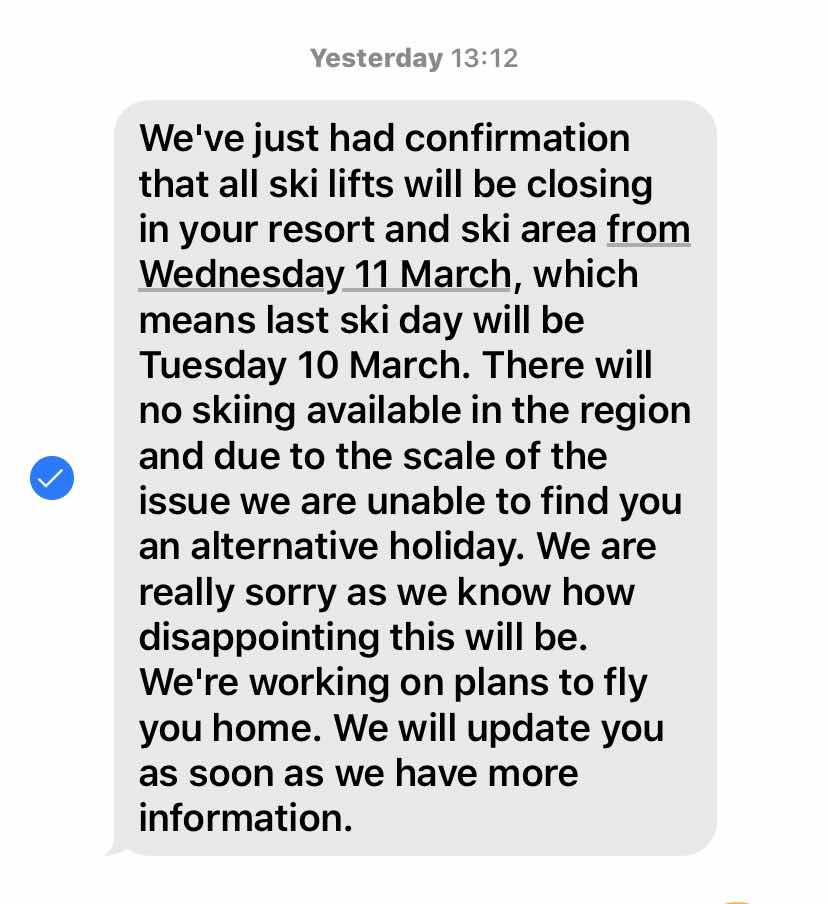 So it was that mellow and relaxed (except Chris) we, and the other Crystal guests met Jess in the bar. It was all arranged she told us. TUI were sending out three aircraft to rescue us. Two Dreamliners and a smaller one. Everyone would be flown to Gatwick, Manchester, or Newcastle, and thence on to the airport of departure. We were going home! We were to look out for a text telling us our time of departure. She then scooped up all our lift passes to arrange the refund. We were also to be refunded four days of our holiday, plus any ski hire. Chris set about ordering some new skis.