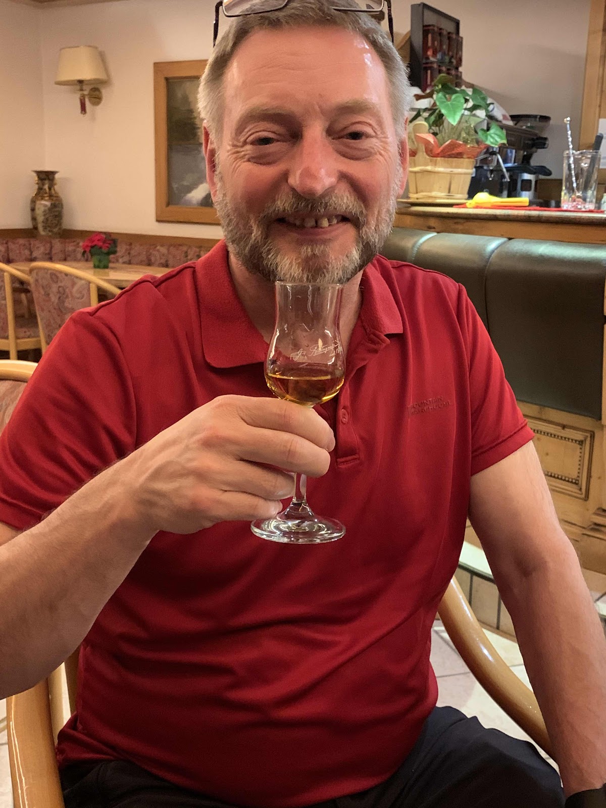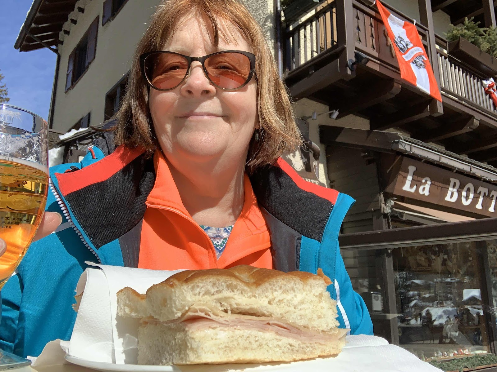 Soon we were on our way in our Enter Air very safe (as the captain worryingly put it) 737. And soon after we were landing in Verona. Comfortingly we had our temp taken on entry, all passed. Just the temp guys were wearing masks, surprisingly. Not long to wait at the carousel as there weren’t many bags on the plane, although there was a bit of excitement when a doctor was hailed and went rushing into a first aid room. Wonder why that was! Ask no questions seems the best policy. The Crystal reps were on hand to direct us to our bus. A list on the front window showed eleven passengers expected, two were crossed out, and another didn’t show up. Just the eight of us then. Wonder why that was. The journey up to Madonna took just over two hours (no toilet stop) and the driver left us outside the Alpen Hotel Vidi. In reception we were met by a pleasant man. ‘Walters you say? Crystal phoned and told us you had cancelled.’ Well, no, cos here we are! Luckily for us he rallied and rustled us up some rooms. Vicky and Alex were pursuaded to go for their skis at this point, then we had a leisurely lunch in a nice cafe.