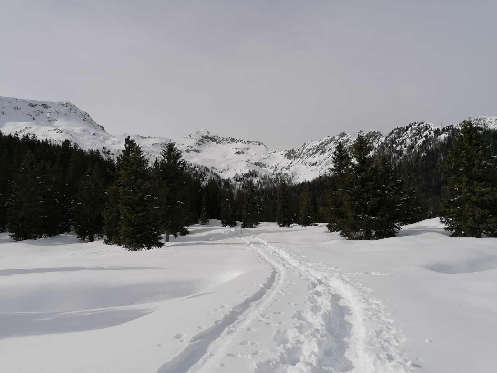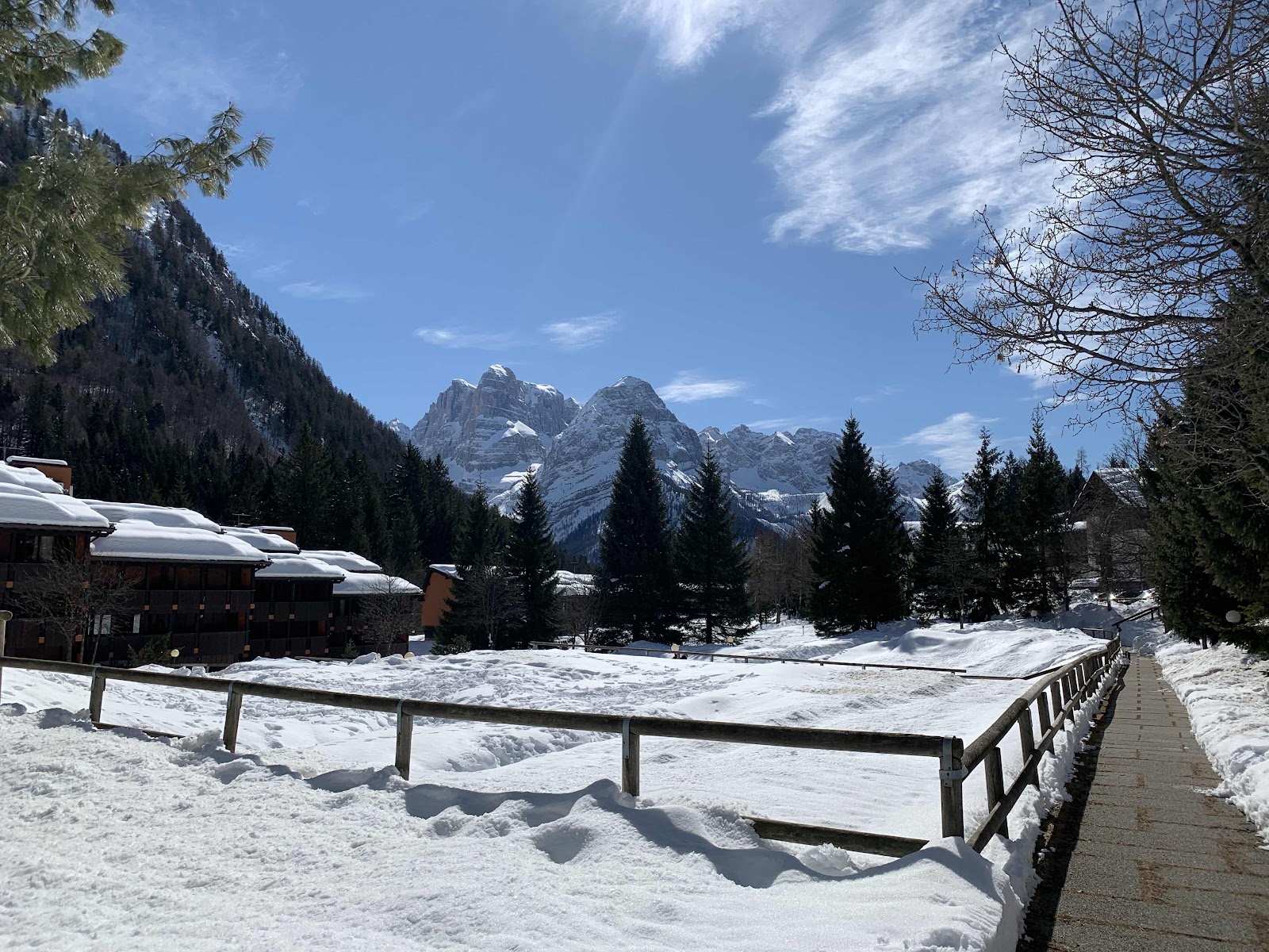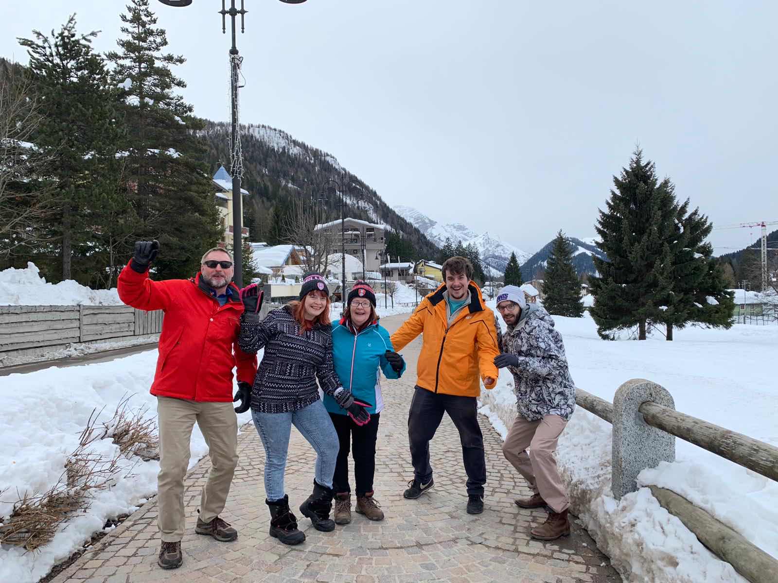 Monday morning was a bit duller than Sunday. Snow was forecast and the tops of the mountains were shrouded in cloud. Never mind. The rest of the week was forecast to be bright and sunny. The keen skiers were up at 8am again, Vicky and I lazed till 9 then mozied on down for breakfast. The keenies has gone off to try a new lift with the idea that Vicky could join them if it was OK. It obviously wasn’t as the text came through to meet at the bottom of Pradalago the same as yesterday. So we went. And waited. And waited. After half an hour in the Alpine cold the bright orange sheen of Alex’s new ski jacket appeared round the bend. Apparently they had got very lost. I waved them off and set off on a walk to the end of the town, again. It was the same as yesterday. I decided against lunch and returned to my room where a text from Ian came through.