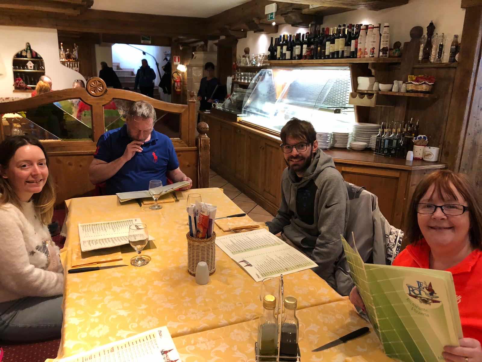 The skiers were having fun times due to the fact that the slopes were really quiet.  I wonder why that was. An early faller was Alex who forgot how to turn about 20 m off the first ski lift. An almost faller was Chris Who went shoulder to Knee with a small Italian child, and although he thought about tossing the child off the slope, found himself being run off it. They stopped for a nice lunch where Alex had a mozzarella ball as big as his head. They then skied some more, everyone of them enjoying it. Vicky even stayed out quite late, not making it back to the hotel till around 4 pm. After a couple of drinks in the bar we all showered and rested before meeting up for dinner in the restaurant. After dinner we played the first round of Yahtzee which Ian won. We are not alone this evening as the other British crystal family and a couple were also enjoying Maurissimos cocktails. I wonder what tomorrow will bring.